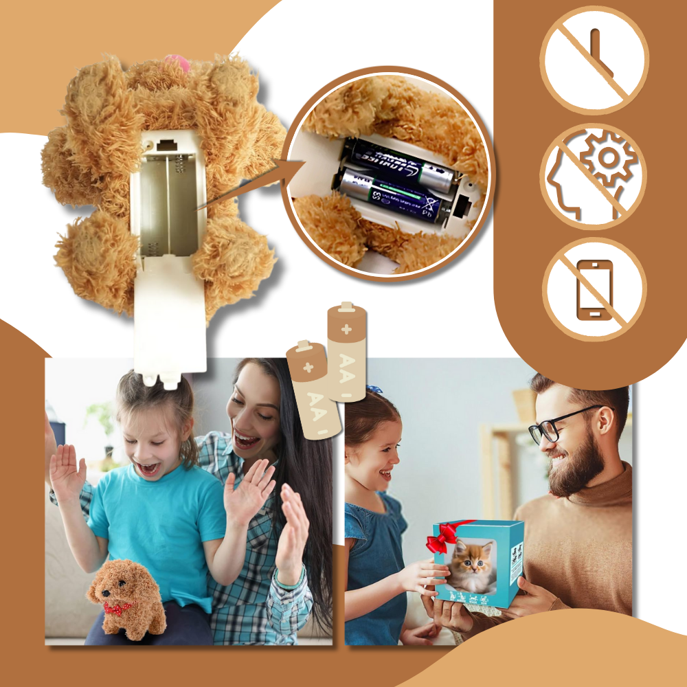 Pour donner vie à l'adorable chiot robotisé, il suffit d'insérer deux piles AA, sans application compliquée, sans configuration fastidieuse et sans compétences techniques requises. En quelques minutes, les enfants peuvent profiter de leur nouvel ami à fourrure et les parents peuvent se détendre en sachant qu'il n'y a rien de compliqué à entretenir. Sa conception intuitive le rend facile à utiliser pour tous les âges, que vous l'installiez pour le premier animal de compagnie d'un enfant ou que vous souhaitiez surprendre un être cher avec un cadeau attentionné.