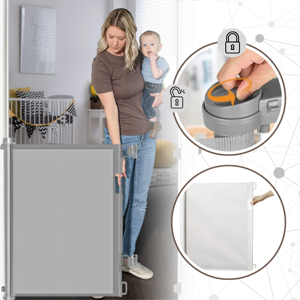 Voici la barrière rétractable en maille pour animaux domestiques et bébés, une barrière rétractable multifonctions qui assure la sécurité des enfants et des animaux de compagnie. Alliant facilité d'utilisation et construction solide, cette barrière élégante est une solution de sécurité flexible et fiable pour toute maison, procurant la tranquillité d'esprit aux parents et aux propriétaires d'animaux.